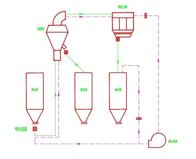 原灰經(jīng)氣力泵送入粉煤灰選粉機(jī),經(jīng)選粉機(jī)分選后,細(xì)灰隨氣流進(jìn)入在另一庫頂布置的布袋收塵器收集,經(jīng)卸灰閥至細(xì)灰?guī)臁4只覐倪x粉機(jī)粗粉口排入粗粉庫。